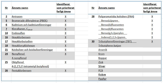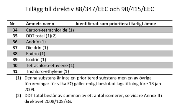 En lista över 33 prioriterade ämnen och ämnesgrupper har fastställts av EU kommissionen (Europaparlamentets och Rådets beslut 2455/2001/EG om upprättande av en lista över prioriterade ämnen på vattenpolitikens område).